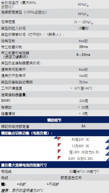 SW60P采用单极双断接主接触器,采用银合金尖端,耐焊接,耐磨,导电性能优良。SW60P采用封闭式顶盖,可提供IP66环保。SW60P具有M6螺柱主端子和6.3mm铲形线圈连接。它可以通过安装支架(随附)安装。安装可以在接触器的侧面或底座上。